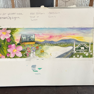 My boyfriend grew up in Stephens City, so it was extra important to do the painting justice. After getting all the details and signing contracts, I got to work. I decided to use watercolors for this piece as I wanted it to resemble my Lahaina Style painting from Maui. Also, watercolors don't take nearly as long as acrylics do for me. Acrylic's require between 5-15 layers, where as my watercolors require just a few for most of my paintings. The space the mural was installed is in the entrance way on the grocery side with the area being 7 feet in height by 30 feet in length. I did some math and figured that out for a smaller scale as I was using a 18x24 sheet of cold press watercolor paper. After mapping out the correct dimensions, I sketched out the painting incorporating the Drive-in, apple blossoms, cows, mountains, sunset, a cardinal, the Stephens City welcome sign, and a Virginia is for Lover's license plate on an old time VW Beetle.